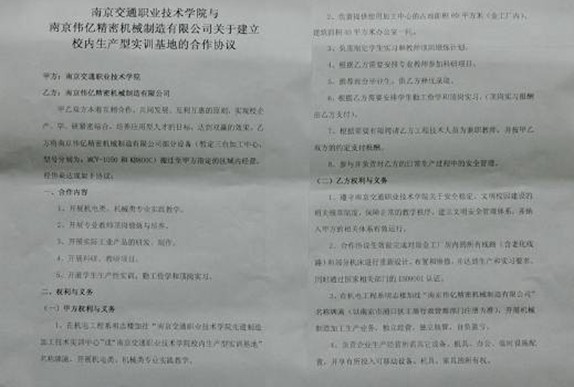 合作协议签署前,高进军副院长与南京伟亿精密机械制造有限公司孙乃刚总经理围绕校企产学研紧密合作进行了深入交流。高副院长说,校企合作是实现工学结合人才培养模式的重要途径之一,校内生产型实训基地的持久有效发展是建立在企业生产经营效益与学院人才培养和教学质量相互得以保证并平衡的基础之上,企业实际生产项目会对教学、学生顶岗实习和师资锻炼起到实质上的促进作用,企业可以深度地参与到专业建设中的课程体系构建、理论和实践教学改革等多方面;他希望机电工程系的教师积极参与企业技术改革和创新,在科研上做出更好成绩,从而实现“校企双赢”。孙经理表示,公司一定会遵照合作协议优先开展学生的专业实践教学、专业教师顶岗锻炼和学生勤工俭学,同时确保安全生产。