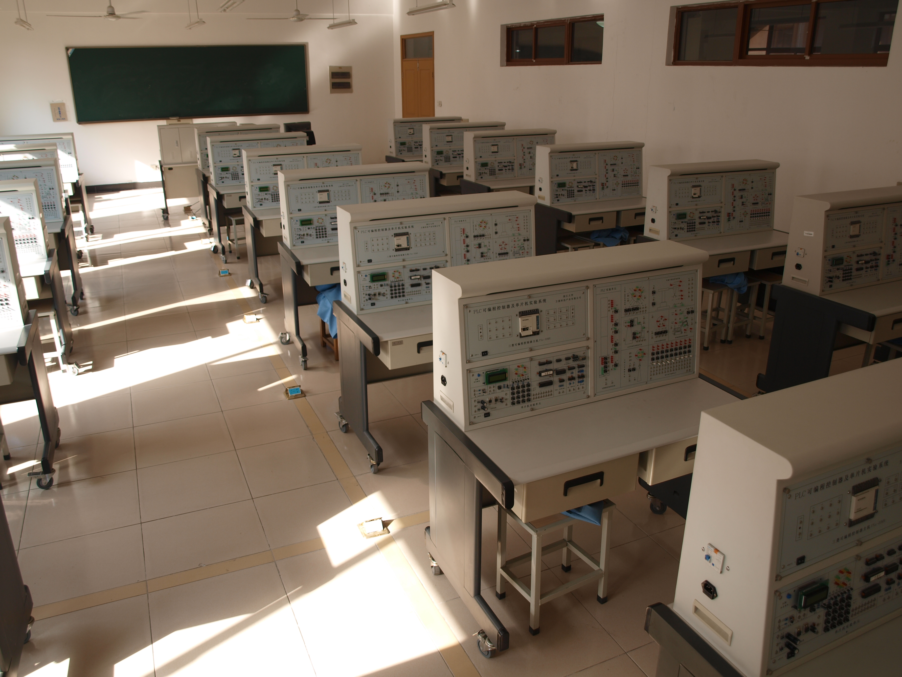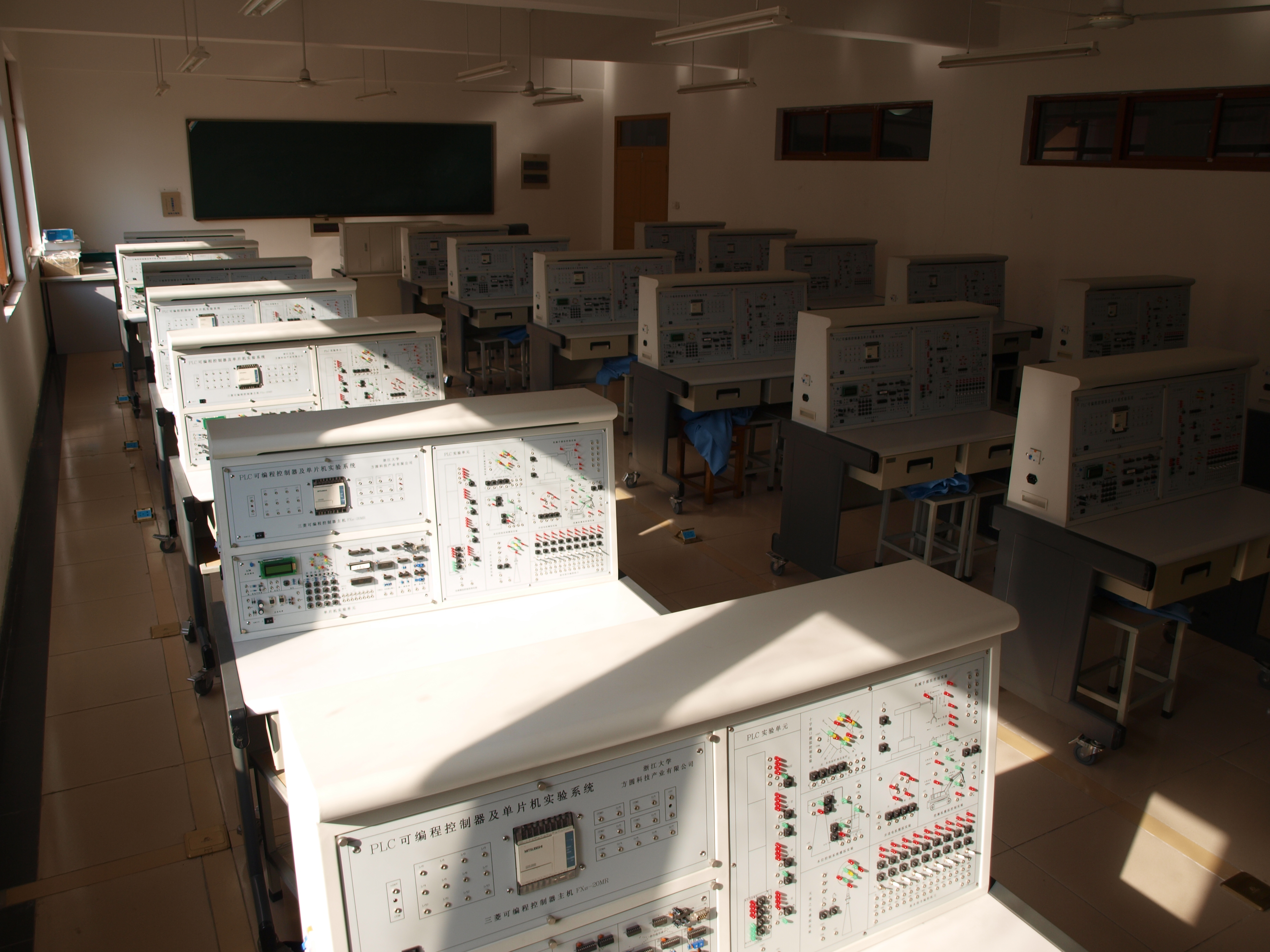 PLC实训室于2005年经学院批准开始建设,实验室面积约115㎡,购置了浙江大学方圆科技产业有限公司专业生产的PLC可编程序控制器实验设备21套,价值约17万。实验室可以做的实验项目:水位控制系统模拟实验、十字路口交通灯模拟控制实验、机械手模拟控制实验、电梯模拟控制系统实验、挖掘机模拟控制实验、天塔之光模拟控制实验、步进电机模拟控制实验。