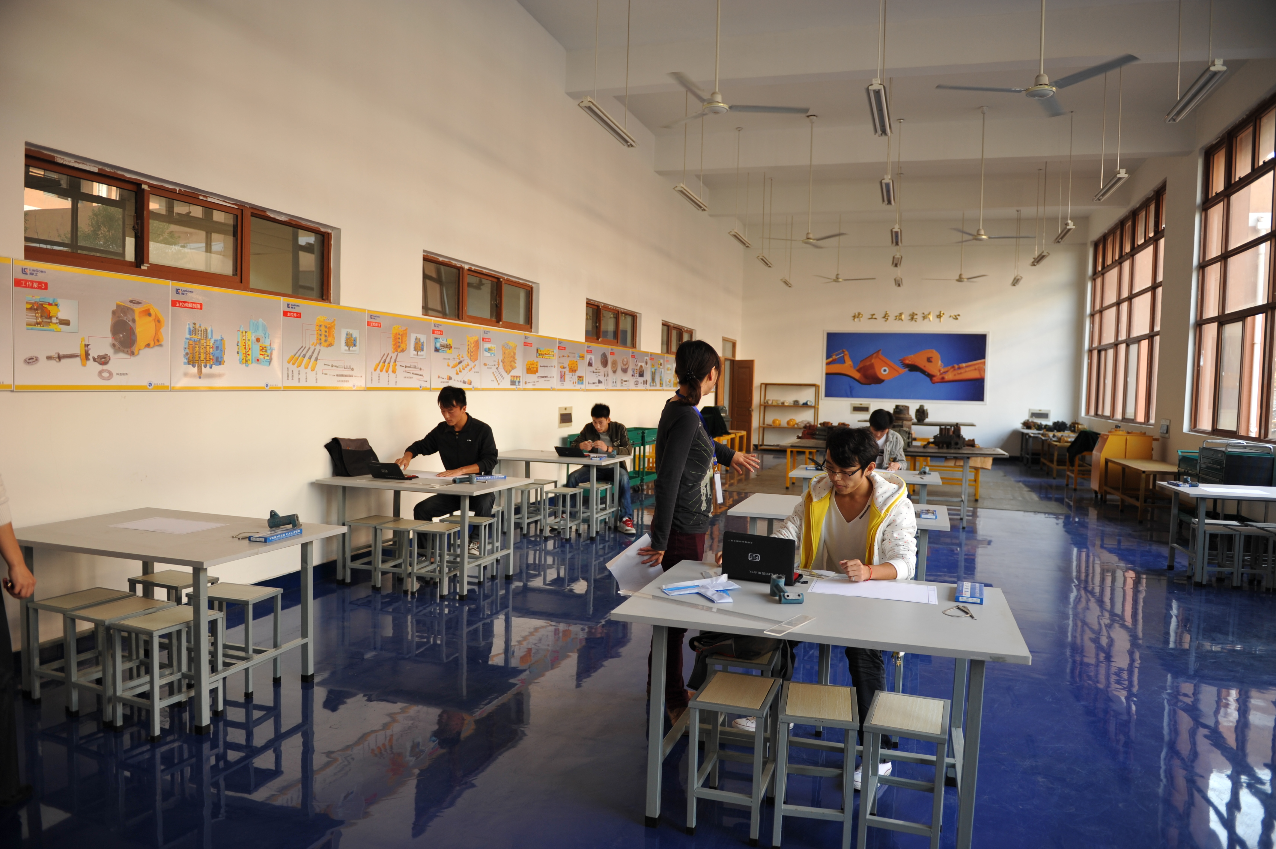 柳工系统化实训中心始建于2009年8月,学院先后投资近50万元购买设备和实训室氛围渲染,建成了理实一体化实训室,主要为工程机械运用与维护、工程机械营销与服务技术专业开设,现能够实现双联泵拆装实训、行走马达拆装实训、回转马达拆装实训、液压缸的拆装实训、主控阀的拆装实训、柳工压路机液压系统故障排除实训、柳工装载机液压系统故障排除实训、柳工挖掘机液压系统故障排除实训、柳工压路机电气系统故障排除实训、柳工装载机电气系统故障排除实训、柳工挖掘机电气系统故障排除实训等多项功能。