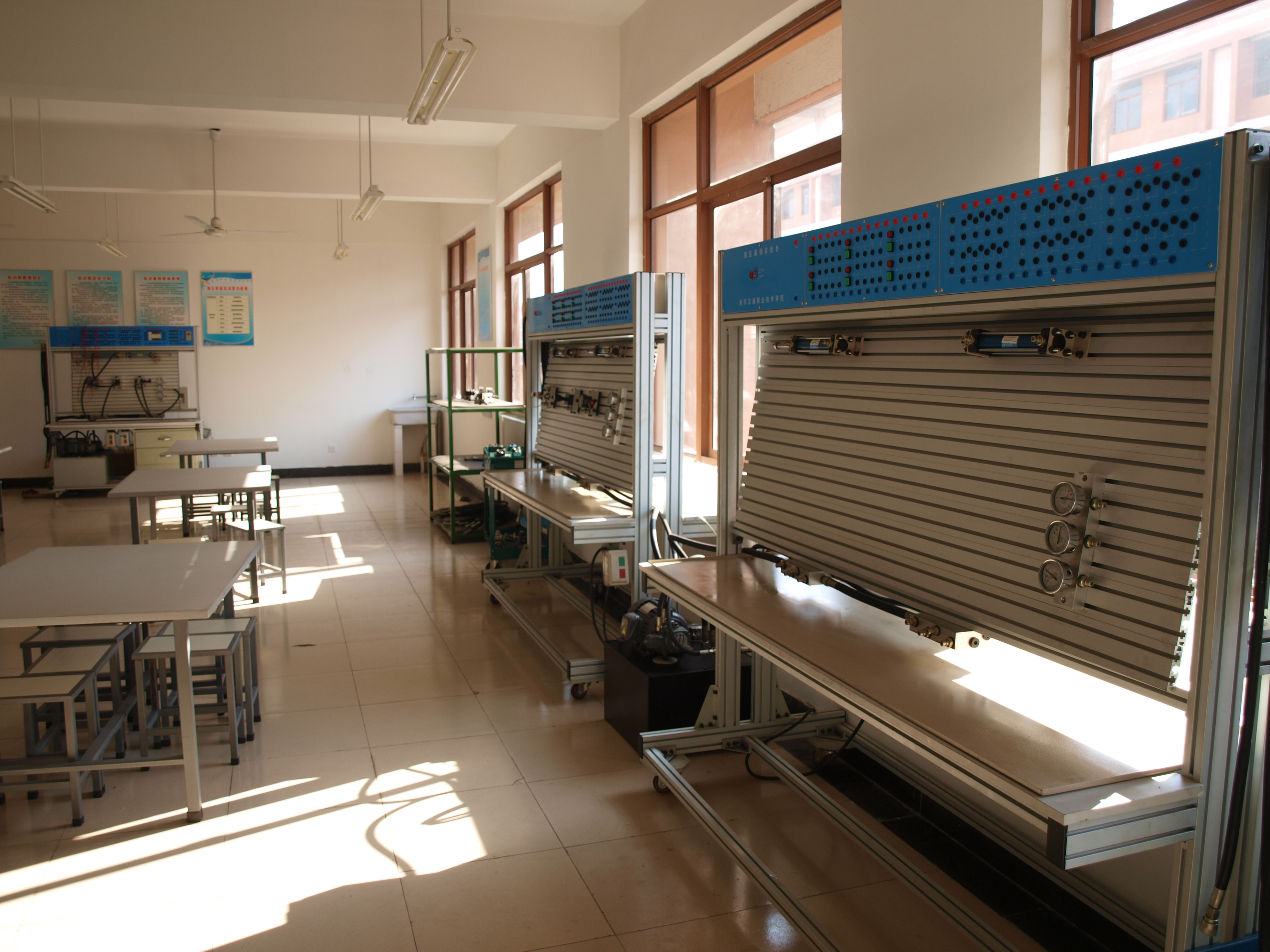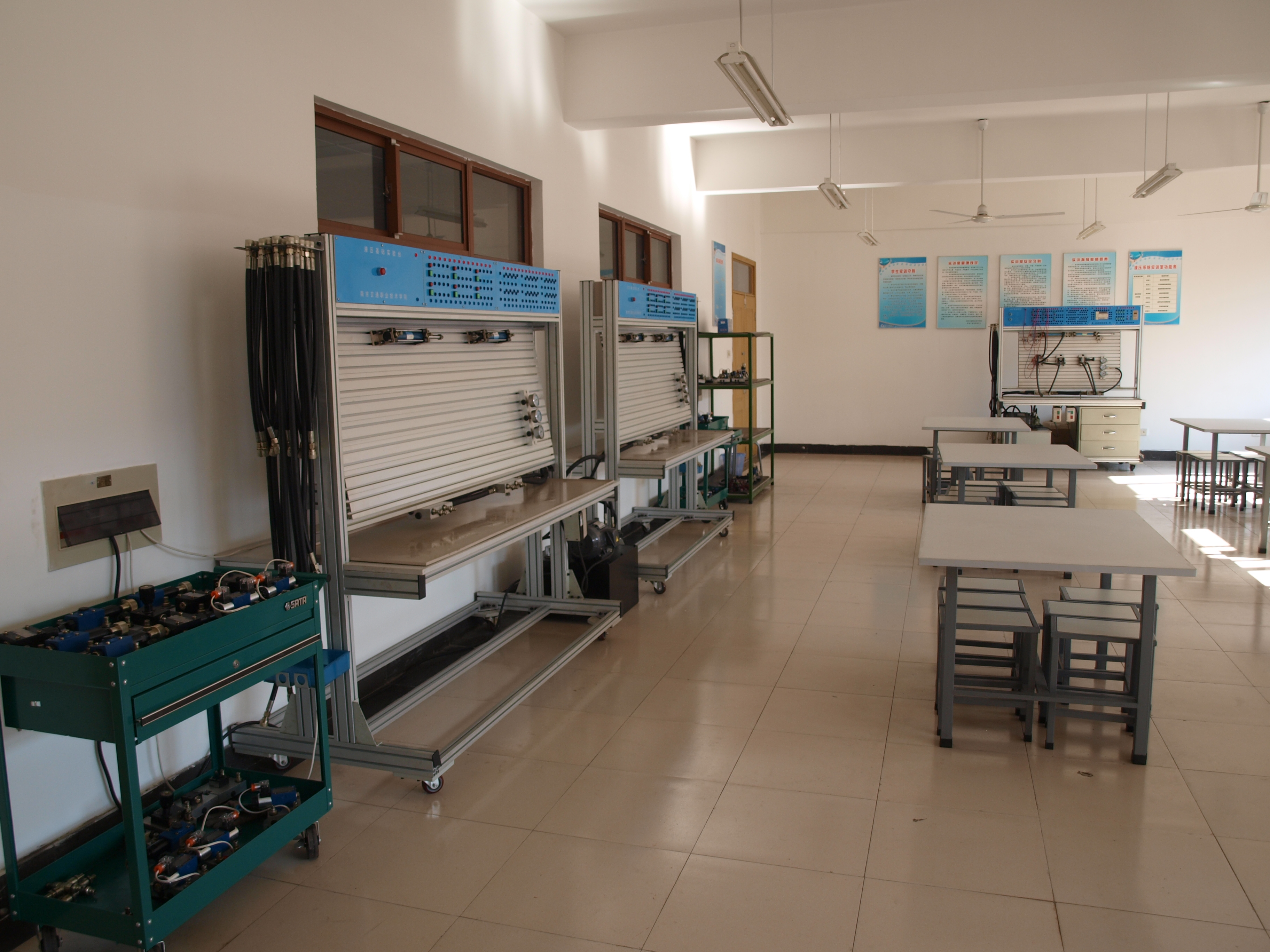 液压系统实训室始建于2009年9月,是由系部老师自行设计制作的液压系统试验台,是为工程机械运用与维护、工程机械营销与服务、机电一体化、电气自动化、模具设计与制造专业使用,能够实现差动回路实验、节流调速回路实验、速度换接回路实验、调压回路实验、减压回路实验、顺序动作回路实验、平衡回路实验、卸荷回路实验等,基本上能满足学生对液压系统相关知识的学习。