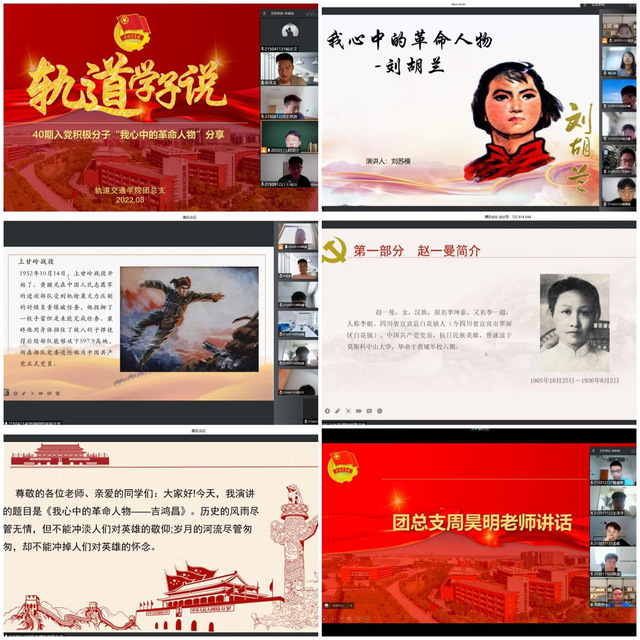 为更好地引导青年学生做到学史明理、学史增信、学史崇德、学史力行,从党的奋斗历程中汲取智慧和力量,2022年8月15日,轨道交通学院团总支于线上开展“轨道学子说”我心中的革命人物故事分享会。学院第40期入党积极分子、部分发展对象和预备党员共计60余人参加分享会,轨道交通学院辅导员主持分享会。