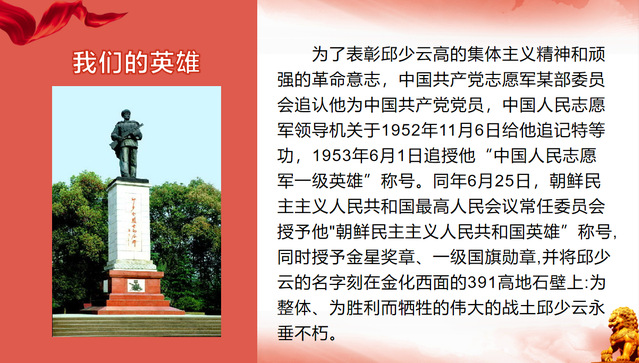2150611班乔滢睿同学分享了抗美援朝英雄“邱少云”的故事。在抗美援朝战争中,邱少云担任潜伏任务,不幸被火焰焚身却岿然不动,严守潜伏纪律。30多分钟后,他在烈火中献出了年轻的生命。他身上所体现出的集体主义精神和顽强的革命意志值得我们每个人去学习。