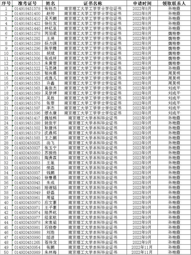 2022年8月申请的南京理工大学工学学士学位证书和2022年9月、11月申请的南京理工大学本科毕业证书已顺利下发,具体领取方式联系相关老师。
