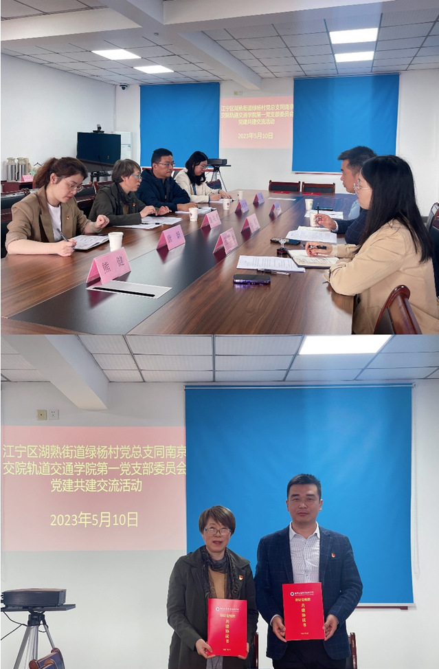 为贯彻落实党的二十大精神,进一步深化党建工作内涵,充分发挥党建引领作用,助力学校与社区互联互通、共建共享,2023年5月10日,轨道交通学院第一党支部与江宁区湖熟街道绿杨村党总支举行了校地党建共建签约仪式,轨道学院党总支书记滕兆霞与绿杨村党总支书记张亮分别代表双方签约。