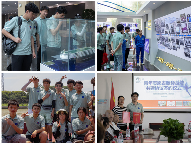 参观交流-洞察水运交通发展现状。实践团队来到了镇江船厂集团和西街社区。通过企业专访调研,团队成员们深刻认识到了船舶制造行业的技术特点和发展趋势,了解到企业在发展水运交通方面所面临的挑战、创新和未来规划,更意识到在机遇与挑战并存的时代下,自身专业能力的发展对于成长的迫切性与重要性。在与西街社区座谈交流的过程中,团队成员与社区居民代表积极互动,详细了解他们对水运交通安全、便利性、未来的发展期望和环境影响等方面的看法。王晋老师和社区杨书记共同为青年志愿者服务基地揭牌,并签署了共建协议书。