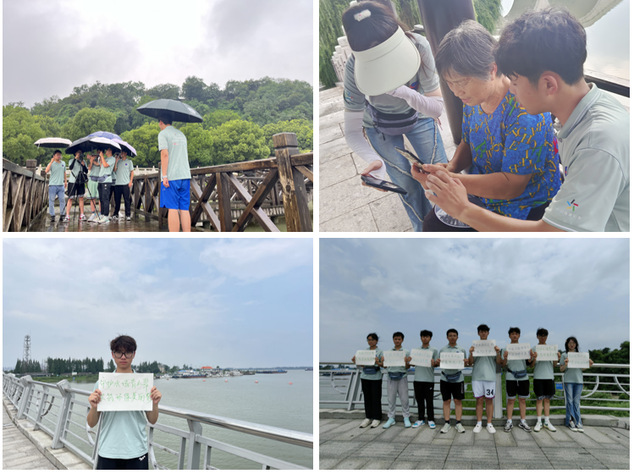 社会服务-弘扬水运交通文化。实践队员们来到了镇江北固湾码头和中国长江生态湿地公园。宣讲人张乐桐同学驻足码头向大家普及了水上交通安全知识,王慧同学讲解了保护湿地生态系统的重要性,从“加强法律法规的制定和执行”、“采用先进的技术和管理手段”、“开展环境监测和评估”等方面呼吁大家推动绿色交通的可持续发展,确保水运交通与生态环境的和谐共生。宣讲结束后,团队成员共同举起不同内容的宣传标语,用简洁有力的语言唤起公众对于大运河生态保护的重视。