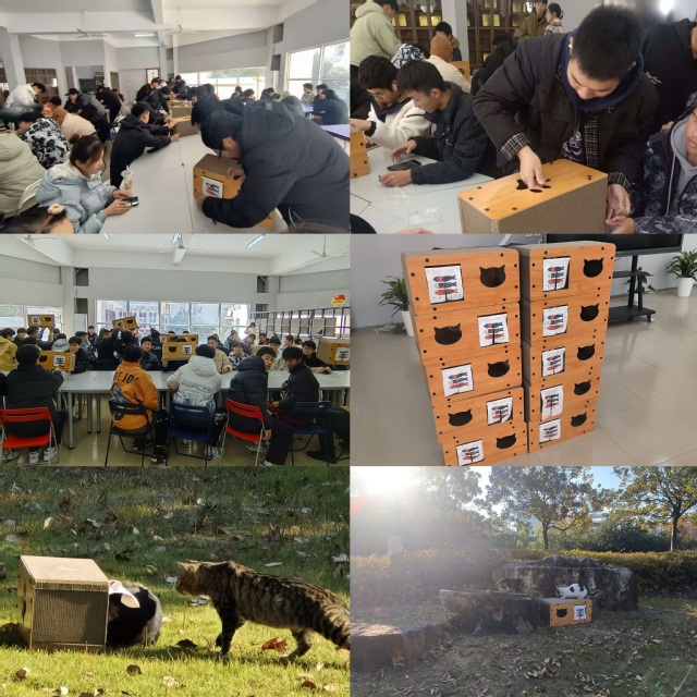 活动伊始,在负责人谭宏伟的带领下,同学们先了解了制作猫窝的相关知识,再分组对网上选购的防水户外猫屋零件进行组装;大家齐心协力,相互配合,为猫咪搭建起爱的港湾。猫屋完成后,同学们前往校园各角落,寻找“猫学长”的踞点并安置猫屋,让交院每一只猫咪都能受到精心的照料,都能拥有一个抵御风寒的温暖小窝。