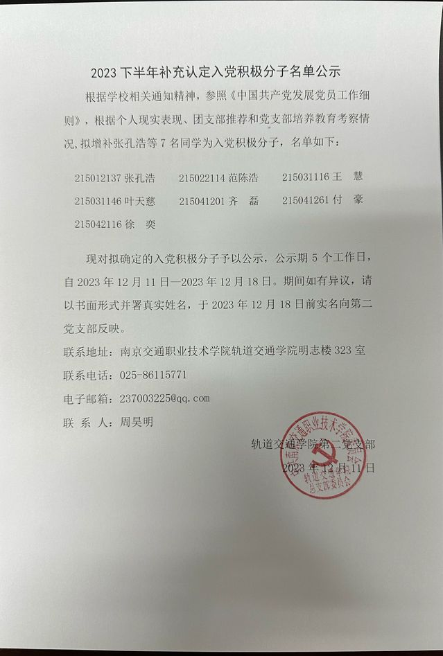 轨道交通学院2023年下半年补充认定入党积极分子名单公示