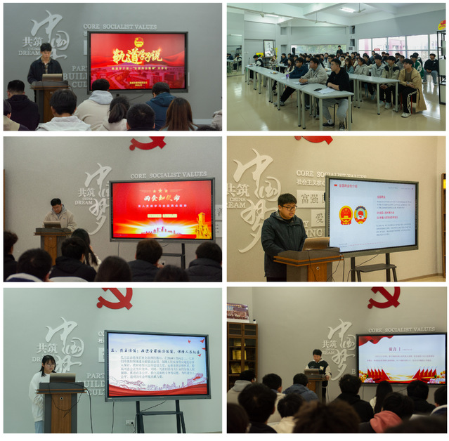 城轨车辆2303班朱佳怡同学结合雷锋月做志愿者的经历,切实向大家介绍了她对贯彻雷锋精神、两会精神的理解,她说:“作为班级团支书,带领班级同学学习团课、新思想公开课,可以进一步深化了解雷锋、两会精神。”城轨通号2202班王宁同学结合两会发展历史向大家介绍两会精神,他说:“在两会精神指引下,我们要继续为中华民族伟大复兴辛勤耕耘,在新时代创造新的辉煌。”城轨机电2302班于文杰同学着重于“职业教育”这一热点话题向大家分享,他说:“我们要将两会精神融入到日常学习和生活中,将两会精神作为指引,不断提升自己的综合素质。”机器人2302班许广贤同学说:“作为当代青年,我们应紧跟国家发展步伐,不断提升自身素质,积极学习新知识、新技能,积极参与社会治理和公益活动,为推动社会发展贡献自己的力量。”模具2201班高道钦同学向大家分享了寒假返家乡的实践经历,他从乡村发展变迁和村民生活现状与大家共同探讨乡村振兴的实践之路。