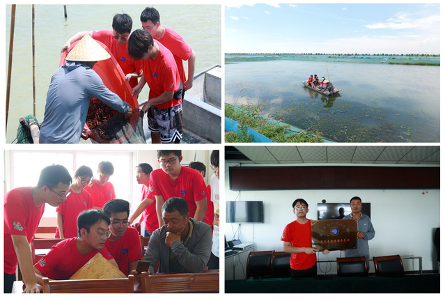 第二站,实践团队来到了洪泽区西顺河镇张福河村。近年来,素有“中国河蟹之乡”之称的张福河村积极开展产业革新,以深化渔旅融合发展为抓手,深度推进“百里画廊”产业升级,打造了“西顺河渔家风情”特色旅游品牌,形成了“渔旅融合发展”新模式。张福河村化勇副主任带领实践团队参观了村里独具水乡风情的建筑、绿色可持续的生态养殖区,双方就渔旅融合、渔民转型、高效养殖、电商直播、乡村振兴等多个方面进行了积极互动、深入交流,同学们深刻感受到了“百里画廊”产业发展的活力与潜力。最后,化副主任与唐伟哲老师共同为青年志愿者服务基地揭牌。
