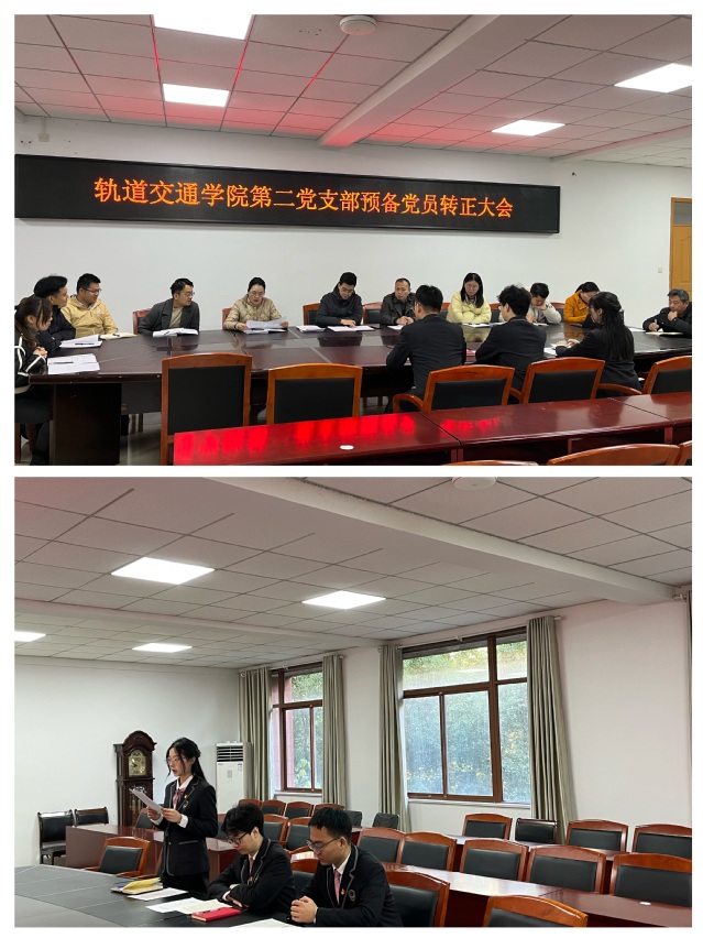 1129日,轨道交通学院党总支第二党支部在明志楼308会议室召开预备党员转正大会。本次会议由第二党支部书记王晋主持,支部大会应到党员11人,实到会10人,请假1人。
