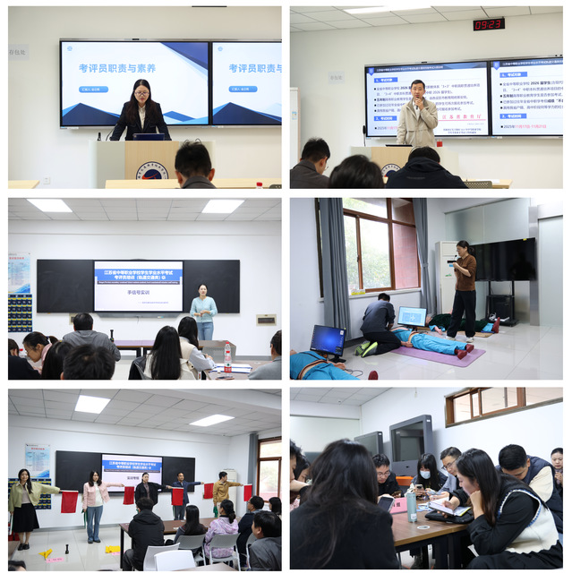 实操培训阶段,教研室金立艳老师系统讲解“考评员职责与素养”,强调公平公正与严谨规范,结合案例剖析考评标准;王亮军老师围绕“考评员工作要点”,从考试流程、评分要点到应急处置多维度展开,深化理解。随后,陶雨濛、石玉香老师组织手信号、心肺复苏项目实训练习,强化学员对评分标准与关键观测点的把握能力。最后通过模拟考评,高度还原考评现场,有效提升参训教师在考评过程中的规范性与应变能力。