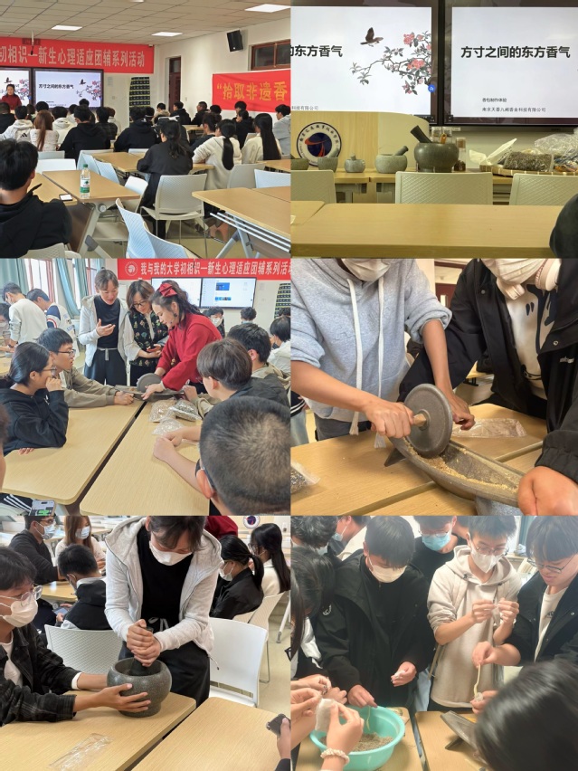 活动在淡雅药香中拉开帷幕。首先,一场生动的香囊文化讲堂为同学们梳理了香囊的历史源流与养生智慧。随后的手作体验环节将气氛推向高潮,同学们兴致盎然地选取布料、香材,亲手操作青石碾、石臼等传统工具,将丁香、佛手柑、黄芩、川芎、紫苏等十余味中药材细心研磨、配伍、填充。现场药香馥郁,笑语盈盈。制作完成后,一件件独具匠心的作品被集中展示,方寸香囊寄托着同学们的美好祈愿。活动尾声,全体参与者手持作品合影留念,记录下这温馨而富有意义的瞬间。