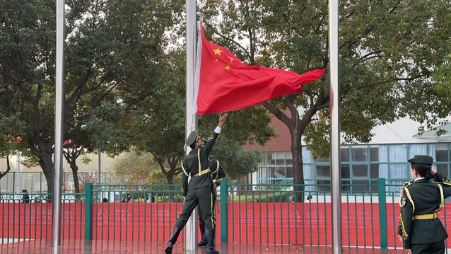 初冬暖阳倾洒于操场,学生们陆续抵达指定地点并列队完毕。七时整,升旗仪式正式启幕。在学生们的注目下,国旗仪仗队队员昂首挺胸,迈着整齐、有力的正步,护送五星红旗走向旗杆。伴随着《义勇军进行曲》激昂雄壮的旋律,学生们肃立凝望,五星红旗在熠熠晨光中冉冉升起、迎风飘扬。歌声结束,本次爱国主题升旗仪式圆满完成,学生们怀着激动的心情有序离场。