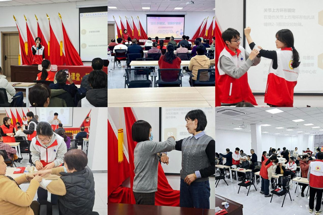 2025年12月10日,轨道交通学院“护航初心”志愿服务团队联合校红十字会在玉树路社区开展“包扎小课堂,银龄护健康”活动。本次活动聚焦老年人日常急救需求,通过志愿者的演示和指导,老人们掌握了基本的包扎手法和秋冬季节相关疾病的预防知识。