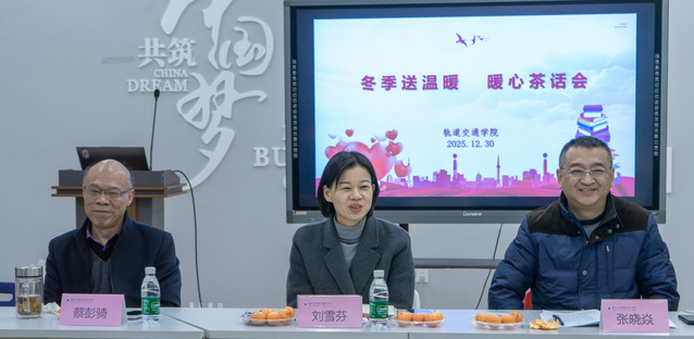 2025年12月30日下午,轨道交通学院在一站式学生社区“南山格苑”工作站开展“围坐话成长,解忧暖心房”-校长暖心茶话会活动。出席本次活动的有学校党委委员、副院长刘雪芬、轨道交通学院党总支书记张晓焱、二级关工委蔡彭骑老师、学工办主任王雪琴、辅导员代表,以及20名家庭经济困难学生代表。活动由党总支书记张晓焱主持。